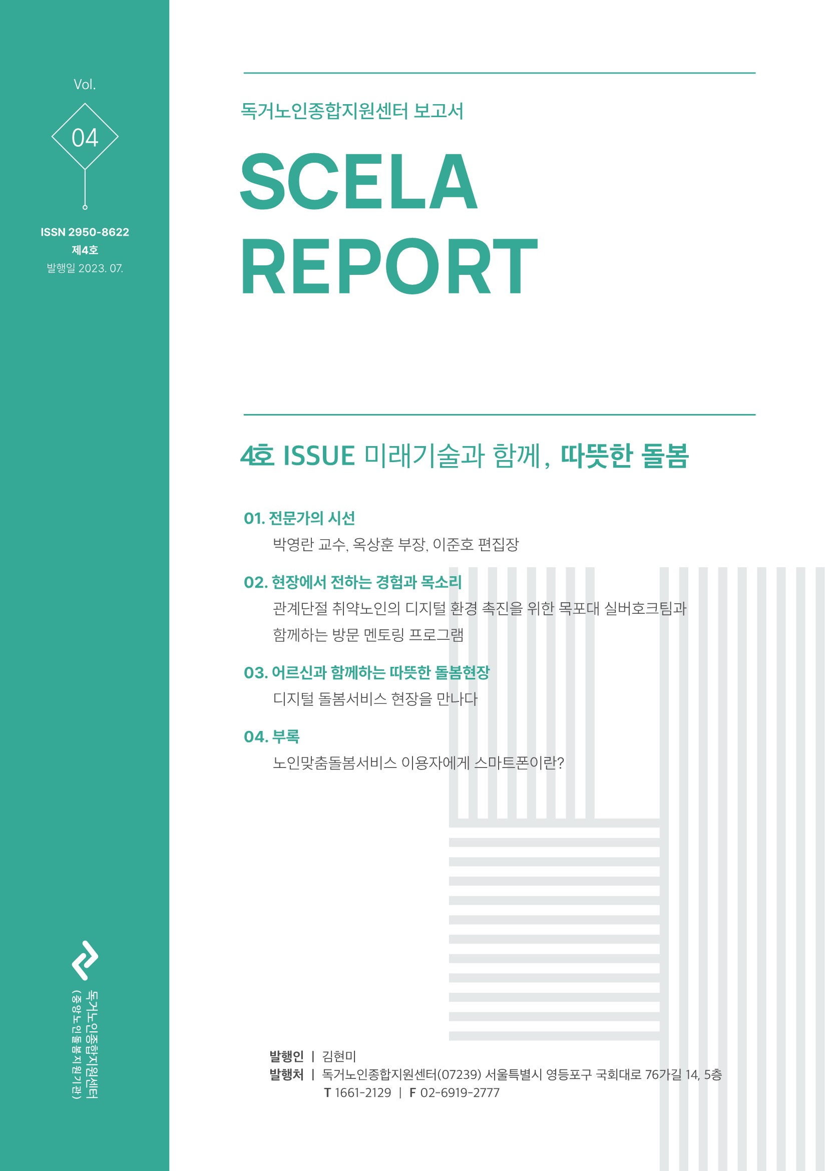전자 간행물 HOME > 알림소식 > 자료실 독거노인종합지원센터 보고서 (SCELA REPORT) 제 8호 2024 취약노인보호사업 공모전 사례집 독거노인종합지원센터 보고서(SCELA REPORT) 제7호 독거노인종합지원센터 보고서(SCELA REPORT) 제6호 2024년 개인정보보호 관리 매뉴얼 2024년 노무관리 매뉴얼 2024년 안전관리 실무매뉴얼 2024년 노인맞춤돌봄서비스 전담사회복지사 업무매뉴얼 2024년 서비스제공 매뉴얼 2023 취약노인보호사업 공모전 사례집(프로그램/영상) 2023 취약노인보호사업 공모전 사례집(수기/사진) 독거노인종합지원센터 보고서(SCELA REPORT) 제5호 2023년 개인정보보호 관리 매뉴얼 2023년 노무관리 매뉴얼 2023년 안전관리 실무매뉴얼 2023년 노인맞춤돌봄서비스 전담사회복지사 업무매뉴얼 2023년 서비스제공 매뉴얼 독거노인종합지원센터 보고서(SCELA REPORT) 제4호 독거노인종합지원센터 보고서(SCELA REPORT) 제3호 2022 취약노인보호사업 공모전 사례집(프로그램/영상) 2022 취약노인보호사업 공모전 사례집(수기/사진) 독거노인종합지원센터 보고서(SCELA REPORT) 제2호 독거노인종합지원센터 보고서(SCELA REPORT) 제1호(창간호) 2021 취약노인보호사업 공모전 수상작품집(프로그램ㆍ영상) 2021 취약노인보호사업 공모전 수상작품집(수기ㆍ사진) 사랑과 나눔을 잇는 행복한 사람들의 열번째 이야기